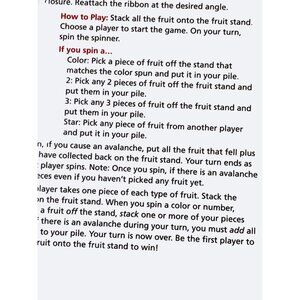 It takes a steady hand to keep the fruit on this stand Players spin the spinner then use the Easi-grip tweezers to carefully select one of each fruit to win the game. But beware, cause an avalanche and its back to the beginning.Perfect for pre school children.