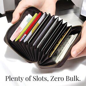 Features: Made from genuine full-grain leather, this slim accordion-style wallet offers a surprising amount of space with 15 card slots. The zip-around closure keeps everything secure, and a detachable keyring adds hands-free convenience. Elegant, durable, and perfect for busy days or travel.