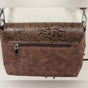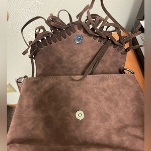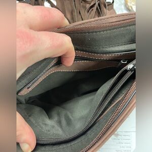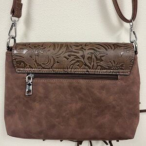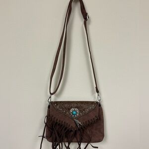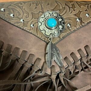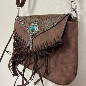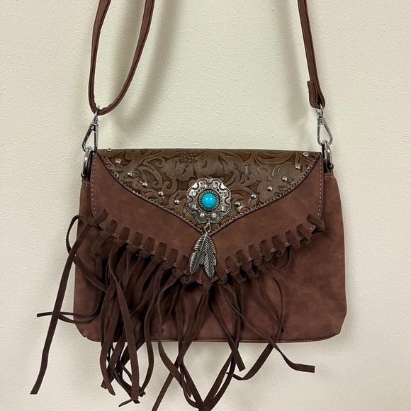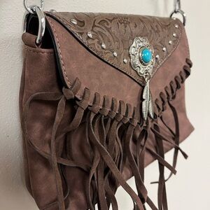 Stylish brown shoulder bag with fringe detailing and a decorative turquoise accent. Perfect for adding a bohemian touch to any outfit.
