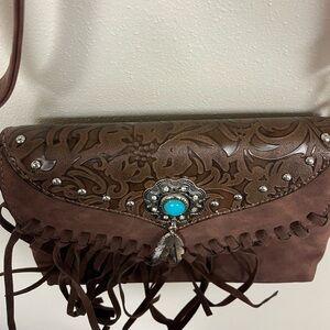 Leather And Turquoise Brown Fringe Shoulder Bag