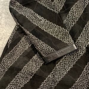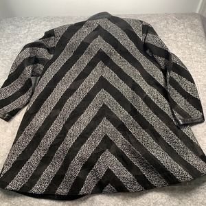 Leather Band Collar Womens 1X Silver Embroidery Mid Length Coat. Pictures don't do this coat justice! It is an amazing 100% leather coat with beautiful silver thread embroidery throughout with V patterns that mix the leather and embroidery. Coat has 3 buttons that button up from mid coat up to neck to give it a stylish open front flare. A staple piece to keep forever! fully lined with two side pockets.