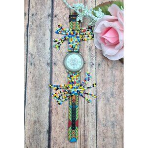 This unique Jacques Couture watch features a colorful, handcrafted design with a leather band and native seed bead accents. The perfect blend of style and functionality, it works and has a brand new battery.