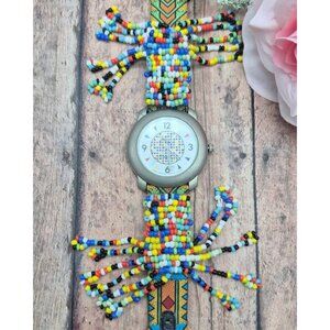 This unique Jacques Couture watch features a colorful, handcrafted design with a leather band and native seed bead accents. The perfect blend of style and functionality, it works and has a brand new battery.