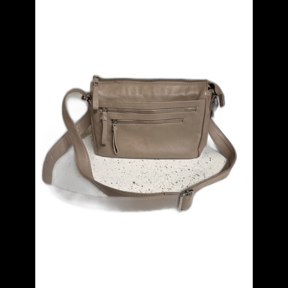 Year round color beige leather purse. Has a lot of compartments. Strap is adjustable. Small spot on front that is hardly visible