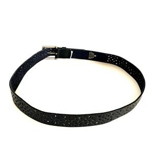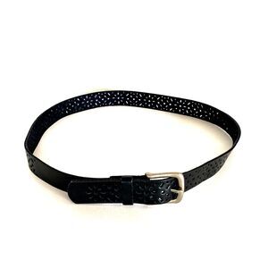 Leather Belt Womens Size M Black Laser Cut 1-1/4" Wide Pewter Tone Buckle