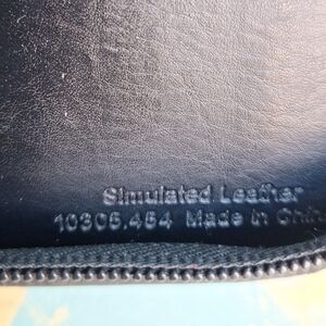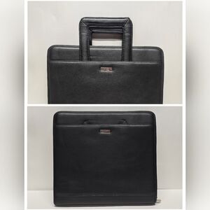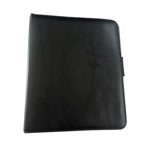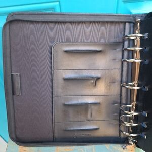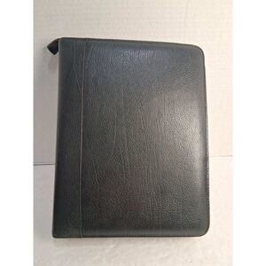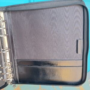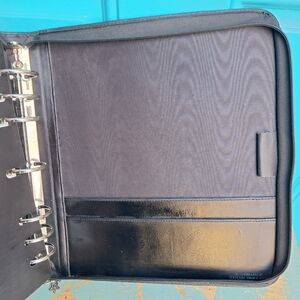 Daytimer Leather Day Planner with Zipper Ring Binder Journal Notebook Holder Retro Black Color Zip up Pouch Day timer Leather Planner Booklet Journal Notebook Holder Attache Resume Holder Retro Vintage Academia Collegiate for writer writing or scheduling or planning booklet notes schedule keeper day timer leather notebook binder. Has pockets on left inside with business card holders and pen holder. Two pockets in back on right inside. Several plastic dividers and some blank paper inside. Simulated faux leather looks and feels real. Silver metal rings in center. Zipper closure.