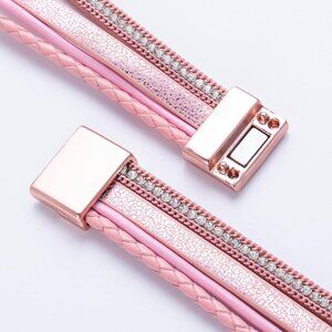 Features: Stylish layered bracelet featuring rosy metallic infinity symbols, beads, and sparkling rhinestones. Soft faux leather strap with a sturdy buckle for easy wear, perfect for stacking or wearing alone.