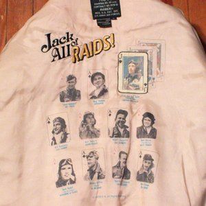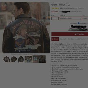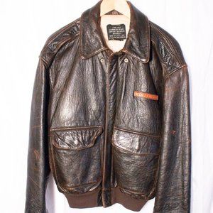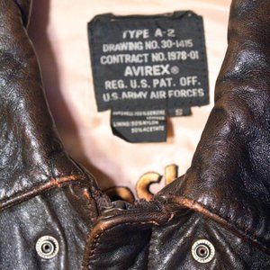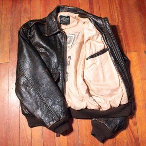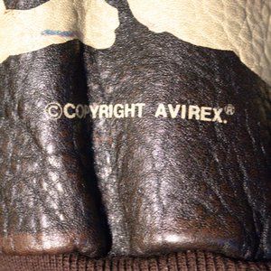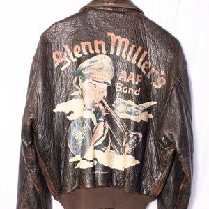 AVIREX A-2 Glenn Miller LEATHER BOMBER JACKET - RARE! Size M, Regular fit. VINTAGE, WORN LOOK. In reality only GENTLY USED. 100% antique lambskin leather, Lined with a silk screened Glenn Miller appliqué, Back screen printed painting of Glenn Miller, Interior screen printed with Pilot "Cards", Front zipper wind flap, 2 snap close flap pockets, Side entry pockets, 2 inside pockets, Knit cuffs and waistband. Proudly made in the USA. Stored smoke-free. Seen priced at over $800 (see sample photo).
