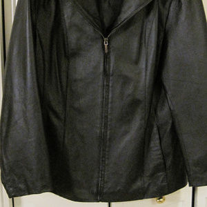 Ladies black leather bomber style fitted zipper jacket with side pockets. Black lining. Used but jacket looks new.