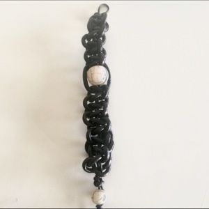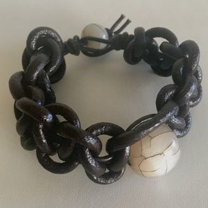 This statement wrist piece looks great with jeans and a tee as well as with a party dress. Braided leather and faceted semi-precious stones make this piece quite the attention grabber.