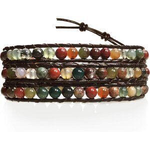 Features: Handwoven genuine leather bracelet with beautiful India agate beads, designed to wrap around your wrist up to three times for a versatile look. Easy adjustable stainless steel snap buttons for a perfect fit. Perfect for adding a boho-chic touch to any outfit.