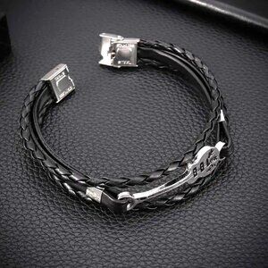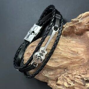 Leather Bracelet Guitar wrist Edgy Rock Bangle Stainless Black Stylish Music NEW