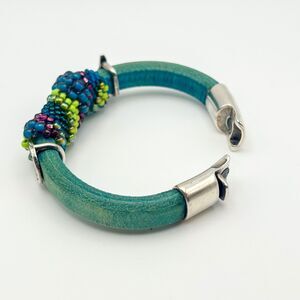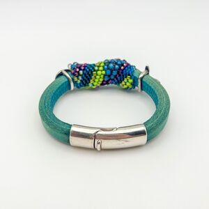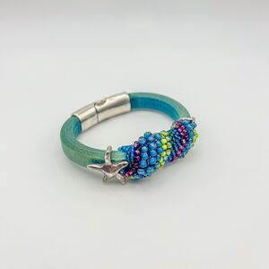 This thick blue leather bracelet features a colorful wrap of blue green and purple seed beads anchored by a silver swirl and starfish slide charm. The closure is a magnetic hook clasp. The underside is stamped leather reading "Made In Spain" please see photos for details, some leather is faded.