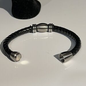 This excellent piece of braided leather features stylish silver tone hardware and a convenient magnetic closure. This bracelet is versatile and unisex, perfect for any outfit.
