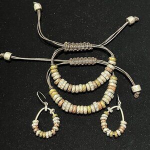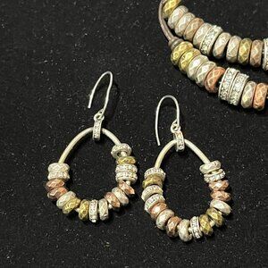 This is a gorgeous set of 2 brown leather adjustable bangle bracelets with hammered circular charms of brass, copper and silver colors and gorgeous rhinestone charms that add a little bling. The matching dangle earrings complete the set. These bracelets are adjustable to fit small and large wrists (see pics). Perfect for layering.