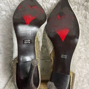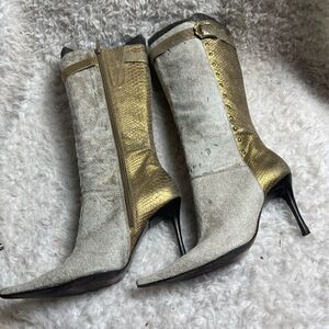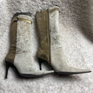 Leather Calf hair beige&gold snake skin pointed toe knee high heels boots SZ9M gold tone brass studs and buckle accent.Pre owned in good used condition some peeling on the calf hair leather doesn’t affect the beauty of the boots see all pictures any questions please message.