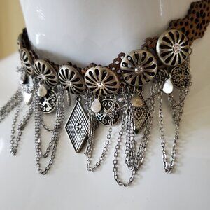 Leather Choker Dangles Crystals Necklace