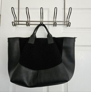 This elegant black Italian leather with sherpa tote bag is great for traveling or work. It fits up a 16" laptop and has interior pockets.