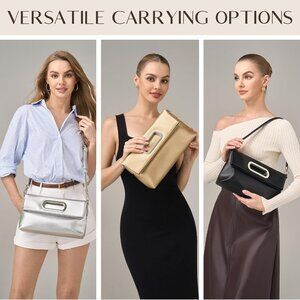 Features: Crafted from high-quality PU leather, this sleek clutch has a fold-over design with a magnetic snap to keep your essentials secure. It features a top handle and two detachable straps, allowing you to carry it as a handbag, shoulder bag, or crossbody. Spacious interior with two pockets — perfect for your phone, wallet, and makeup. Ideal for work, evening outings, or casual errands.