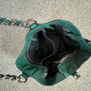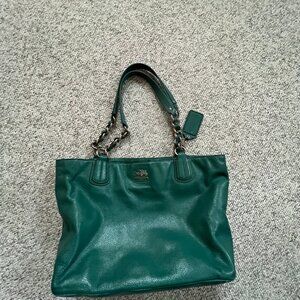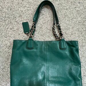 Genuine leather Coach purse, wallet and change/credit card set. Gently used, in perfect condition, no scrapes or scratches, pouches and zipper compartment. All zippers work nicely nothing broken or ripped. Hardly used, very nice condition. Measurements = It is 5" wide. From the bottom of the purse to the top of the handle is about 19". The purse size is about 15" long and 9" tall. It's a buttery soft teal color. The wallet is approx. 8x5 and the smaller change purse/credit card wallet is 4x3.