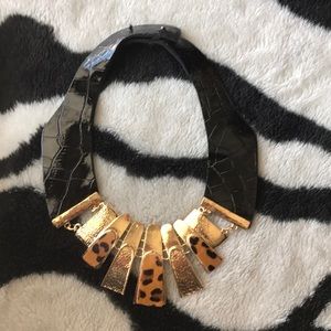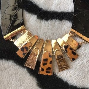 Leather Collar Cheetah Tribal Necklace Gold Plated and Cheetah Print Connected Pieces