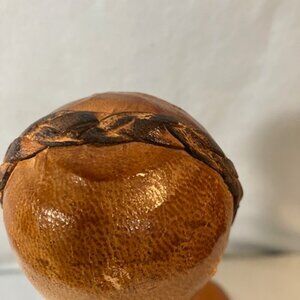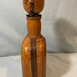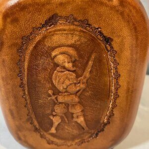 Beautiful leather with an embossed conquistador on the front. Braided leather around the neck of the decanter and across the top of the stopper.