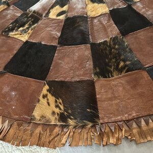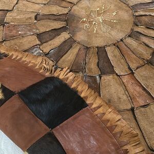Unique circular rug with a patchwork design. Features brown and black colors with animal print accents.