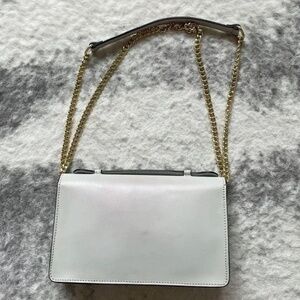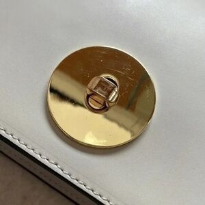 Bag is used under 4 times and in good condition. The back side of the bag has staining as shown. Underside of the bag has some small faint black stains. There are also some areas that are lifted in the leather on the back and underside. Gold closure has some scratches.