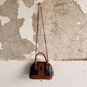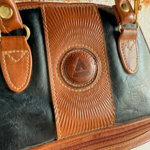 Structured leather satchel crossbody in black and brown two-tone with embossed Dolce Vita medallion front. Early 2000s designer piece with dual rolled handles, long crossbody strap, and extra base zip compartment. A retro leather handbag that reads part western heritage, part downtown boho, the kind of accessory that feels styled even when it’s just carrying your coffee and keys.