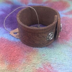 Beltline co naturals handcrafted upcycled leather cuff. oak leaf design, sizable option, 7 in / 7.75 in