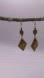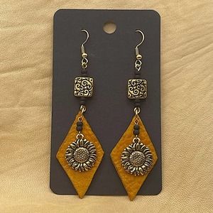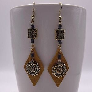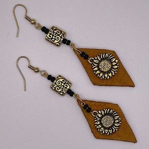 Handmade with buffalo hide leather, hand stamped into a diamond shape and then hand dyed with golden yellow leather dye. I then applied a satin finish to seal and protect the leather. They also have square antique gold beads, matte black seed beads and antique gold sunflower charms and findings. They also have gold tone ear wires and are very light weight.