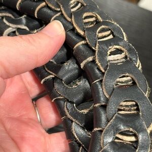 Very sturdy well made woven bag.. some wear but really give it character. Multiple colored leather.