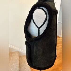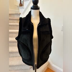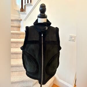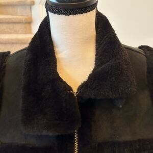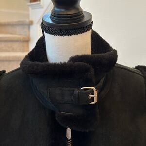 Excellent condition. Black leather with a faux shearling detail. Silver full length zipper. Buckle detail at the neck.