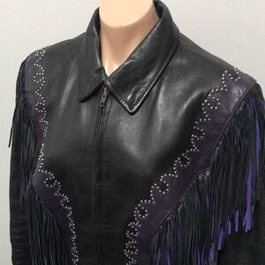 Make a statement in this stand out jacket. Nashville vibes all the way! Black leather jacket with 3M thinsulate. Black has a gradient to purple. Great condtion BESIDES the white marks shown in the 8th photo; they’re on the back of the right arm. Full zip jacket. Zip sleeves. Pocket inside. Cinched at back for more fitted look. FRINGE FRINGE FRINGE all across the front and the back! Silver studs. Jacket is heavy and heavy duty! Soft leather.