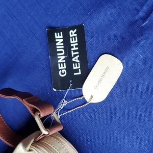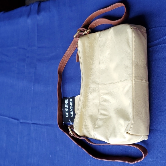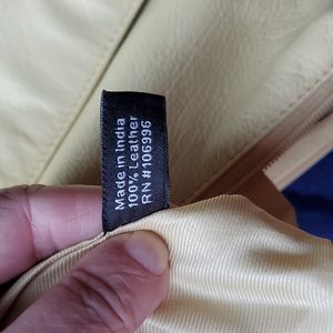 Leather Handbag, NWT, can't determine maker. Gorgeous butter yellow with brown trim/strap, gold hardware, flat base. Outer zipper pocket, outer slip pocket (6 in deep) with snap closure. Two main compartments with zipper closures, two slip pockets in one of the main compartments and a zipper pocket in the other main compartment. This bag will take you through spring, summer and fall! 9 in high, 13 in wide, 4 in deep, adjustable strap with maximum drop of 27 in.