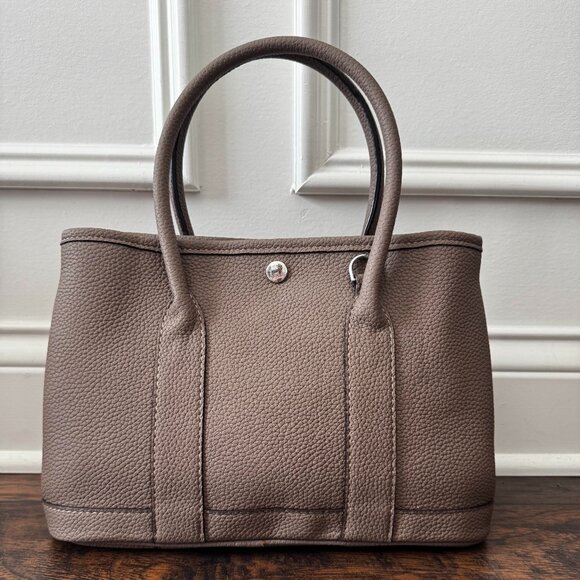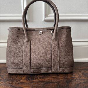 Leather Handbag Small Tote Taupe Silver Horse Carriage Taupe Logo