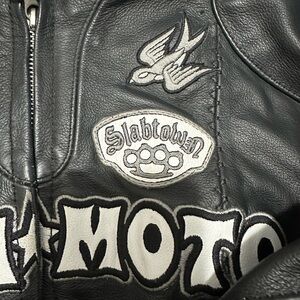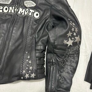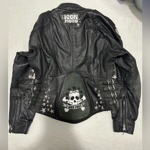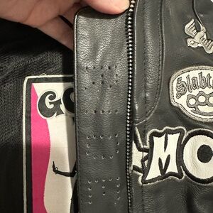 Vintage Leather Icon GoGo Bombshell Motorcycle Coat In Very Good Condition. Size small with corseted sides. No holes or rips and it only smells like good leather. I don’t have the liner. I took it out because it’s so hot in warm weather. Saint Christopher in the inside breast pocket. The coat is so sick. Matching leather chaps listed separately if interested. Cross posted.