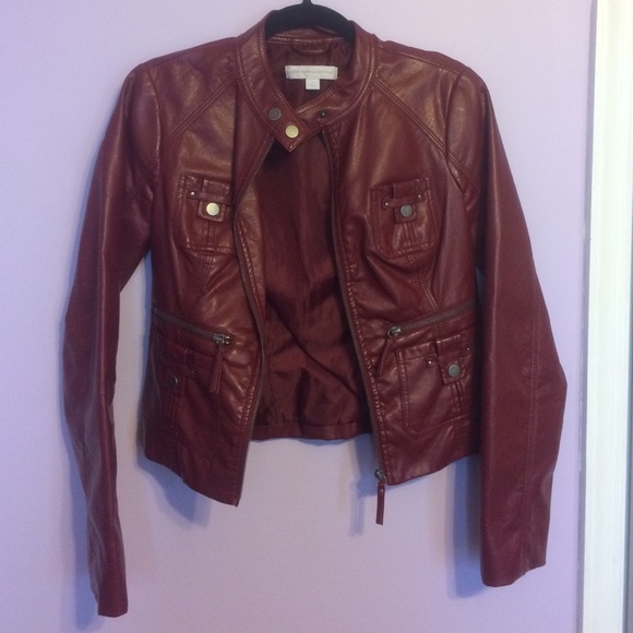 A burgundy leather jacket from New York & Company. Lined with 100% polyester so it's perfect for spring and fall. Only worn twice!