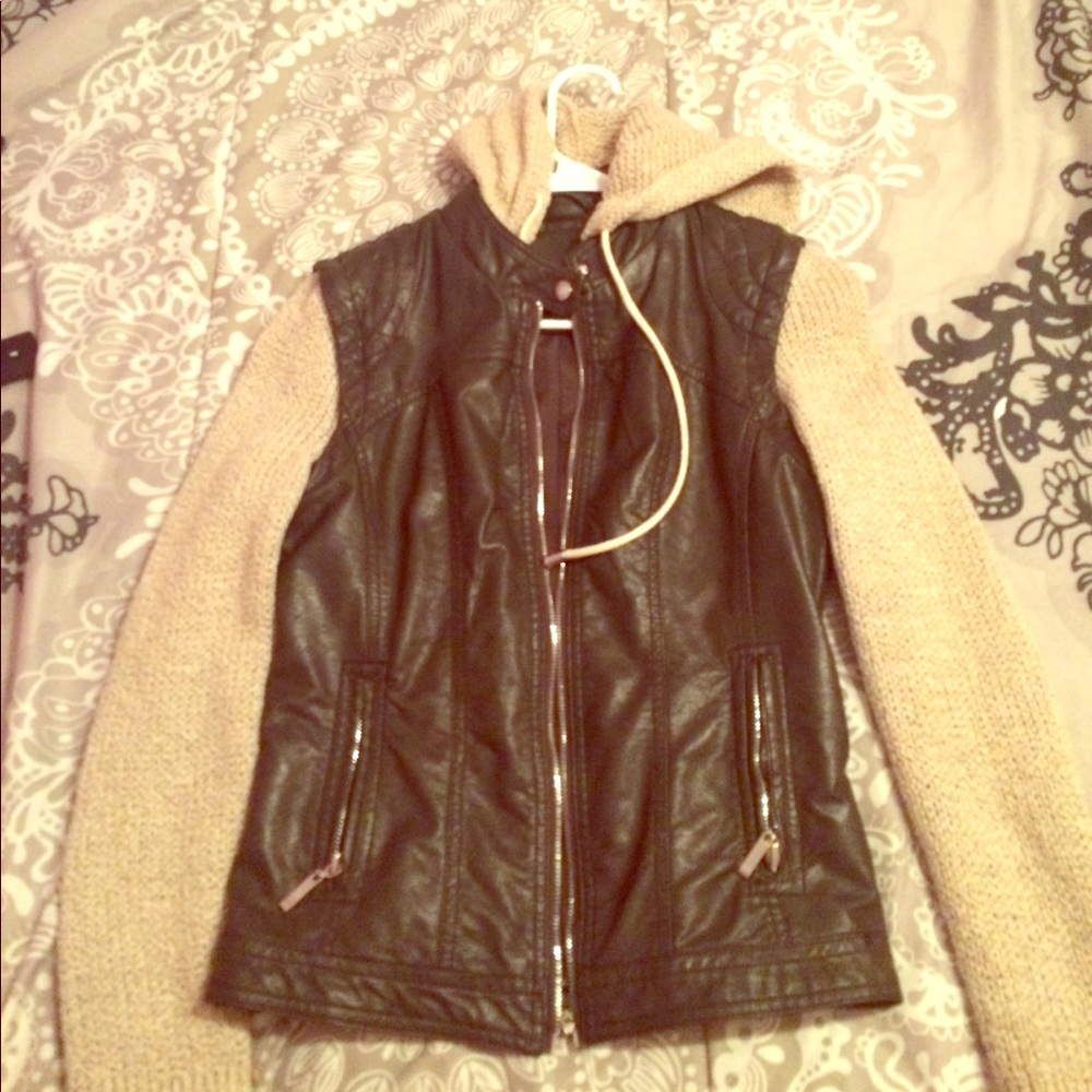Dark Chocolate Leather Jacket with knitted cream sleeves. Sleeves are detachable making it a vest (optional)
