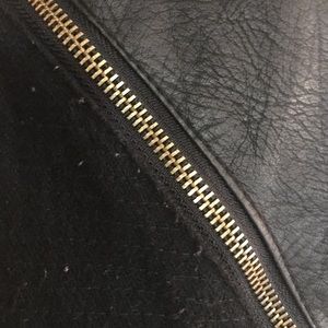 fashion staple mixed material faux leather/wool moto jacket with brass hardware. some pilling on the wool visible in last pic