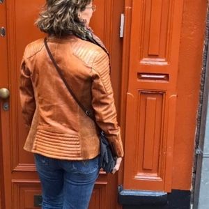 Great color, warm, good for fall. It was bought in Amsterdam and don't use it as much as I thought I would in Florida. Comfortable. Size 46 is a women's medium. I usually wear a medium or size 8 to 10 in jackets. I would call it a honey color