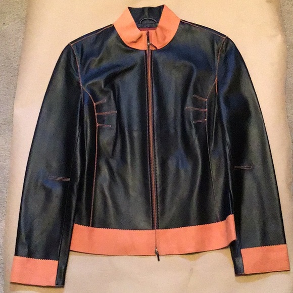 Black Italian Leather and Coral Suede Trimmed Jacket