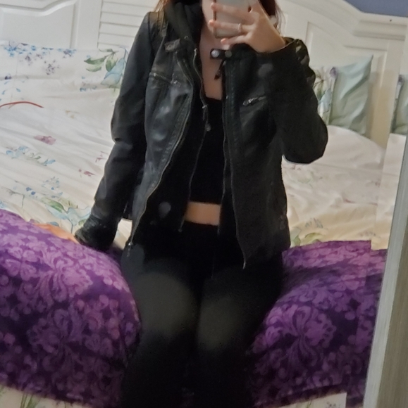 Black leather jacket with hood. Size S