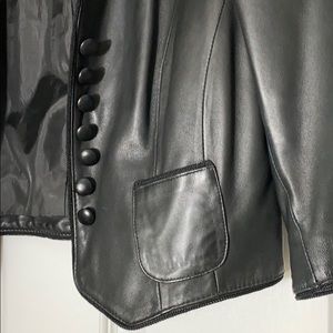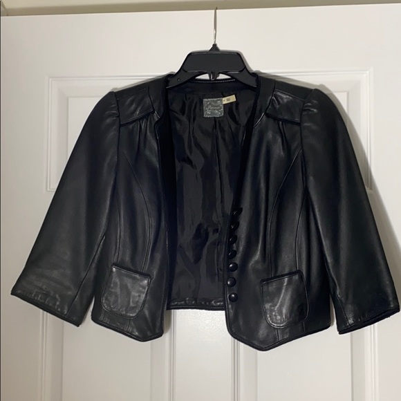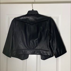 Cropped style with beautiful detailing; buttons and trim. Quarter sleeve. 100% leather with 100% poly lining. Pocket details.