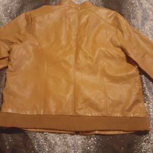 Tan leather Jacket! Does have a slight liner for those chilly days. It length reach to your waist/ pant line. Full length zipper with a over lapping button on the collar. Buttons on the cuffs to tighten cuff size. 4 pockets 2 with zippers. A must have for fall or spring!