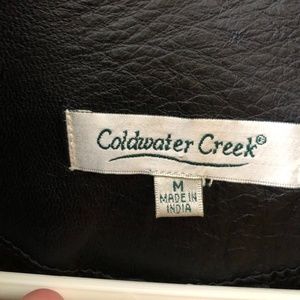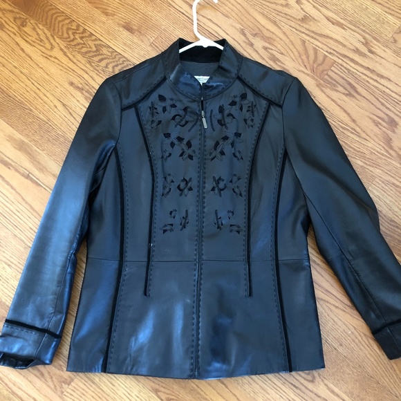 Black women's leather jacket. High collar with beautiful floral vine design on the front lapels. Excellent condition. Previously owned.