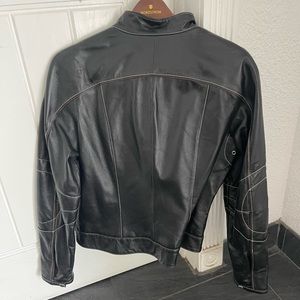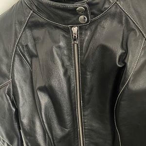 Black leather moto jacket with stitching on jacket and sleeves . Zipper in front with snaps at neck and waist . Beautiful jacket never worn !!!!!