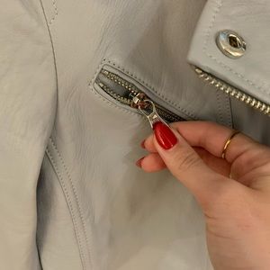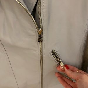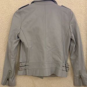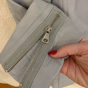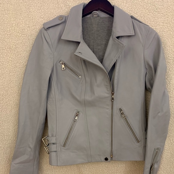 Light blue/dusty blue leather jacket. Silver hardware - all functional. Lined with grey cotton/jersey. Worn once.