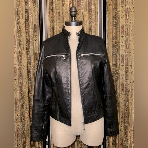 Black leather jacket purchased in UK. Size says 12, fits like a medium. In great used condition, just a few marks here and there common to leather jacket use. (Hardly noticeable and adds to biker leather look😉). Great jacket just doesn’t fit me any more. Measurements are 18 inches across armpit to armpit, Sleeve is 24 inches from shoulder to wrist, length is 21 inches long from neck/shoulder to hem bottom