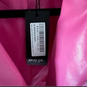 Pink faux leather Jacket with feather trim..Brand New with tags. Super cute for Vday or any occassion. Size 8..It would best fit a medium/large.. See last photo for measurements.